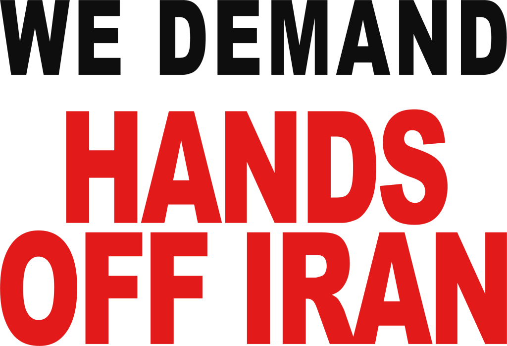 HANDS OFF IRAN signs and postcards